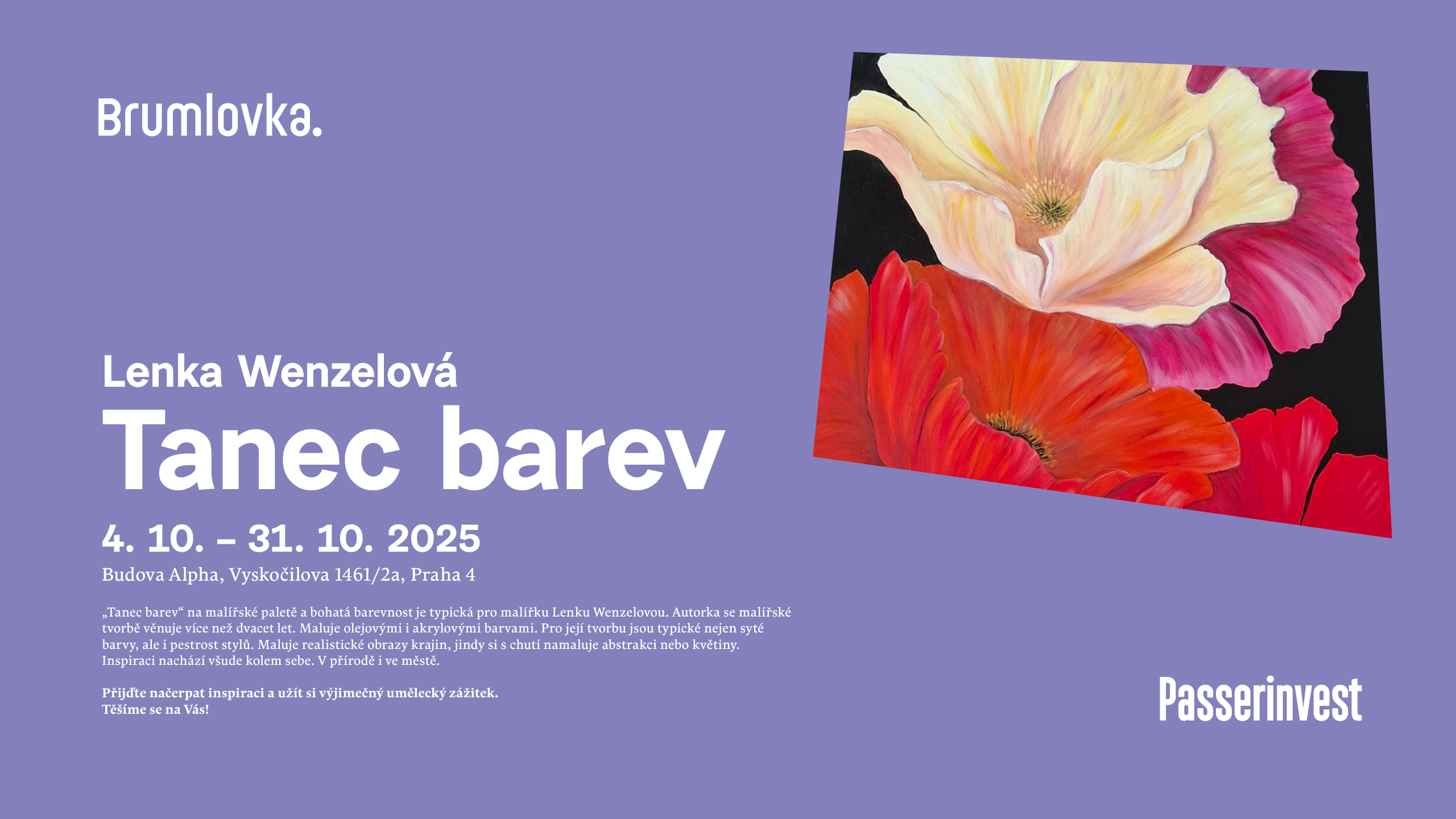 „Tanec barev“ na malířské paletě a bohatá barevnost je typická pro malířku Lenku Wenzelovou. Autorka se malířské tvorbě věnuje více než dvacet let. Maluje olejovými i akrylovými barvami. Pro její tvorbu jsou typické nejen syté barvy, ale i pestrost stylů. Maluje realistické obrazy krajin, jindy si s chutí namaluje abstrakci nebo květiny. Inspiraci nachází všude kolem sebe. V přírodě i ve městě. Přijďte načerpat inspiraci a užít si výjimečný umělecký zážitek.