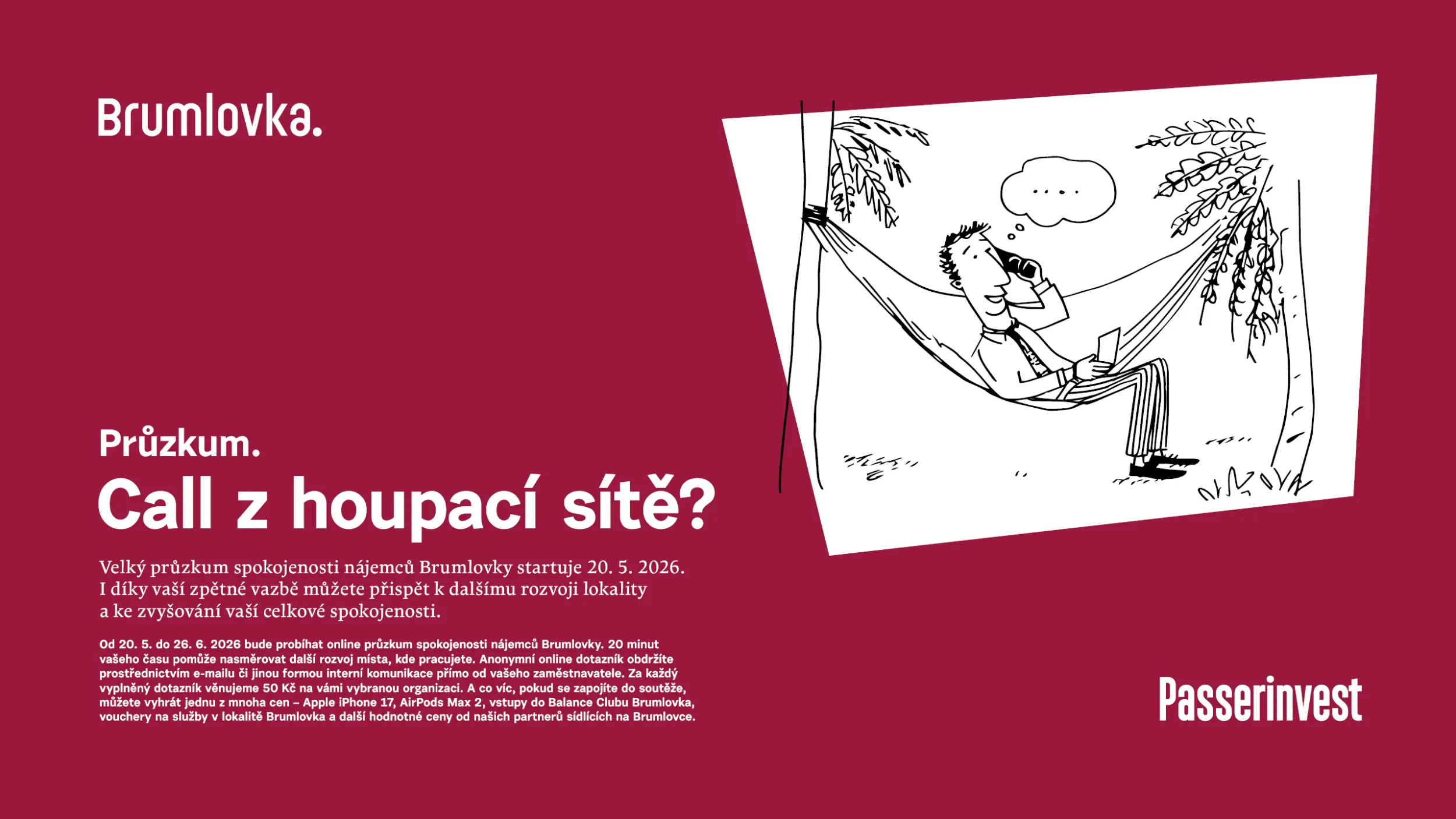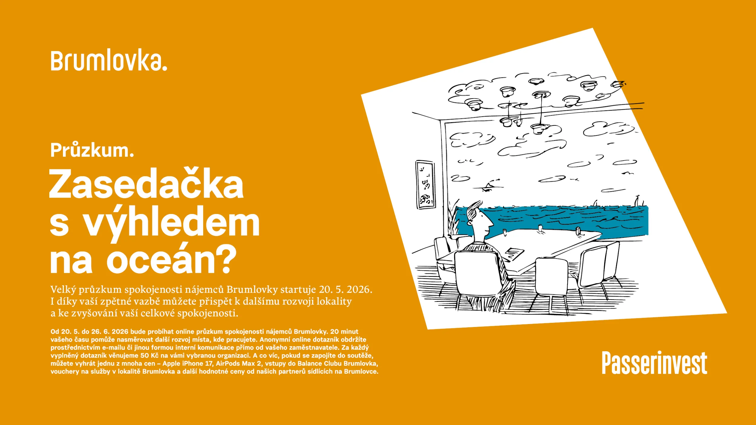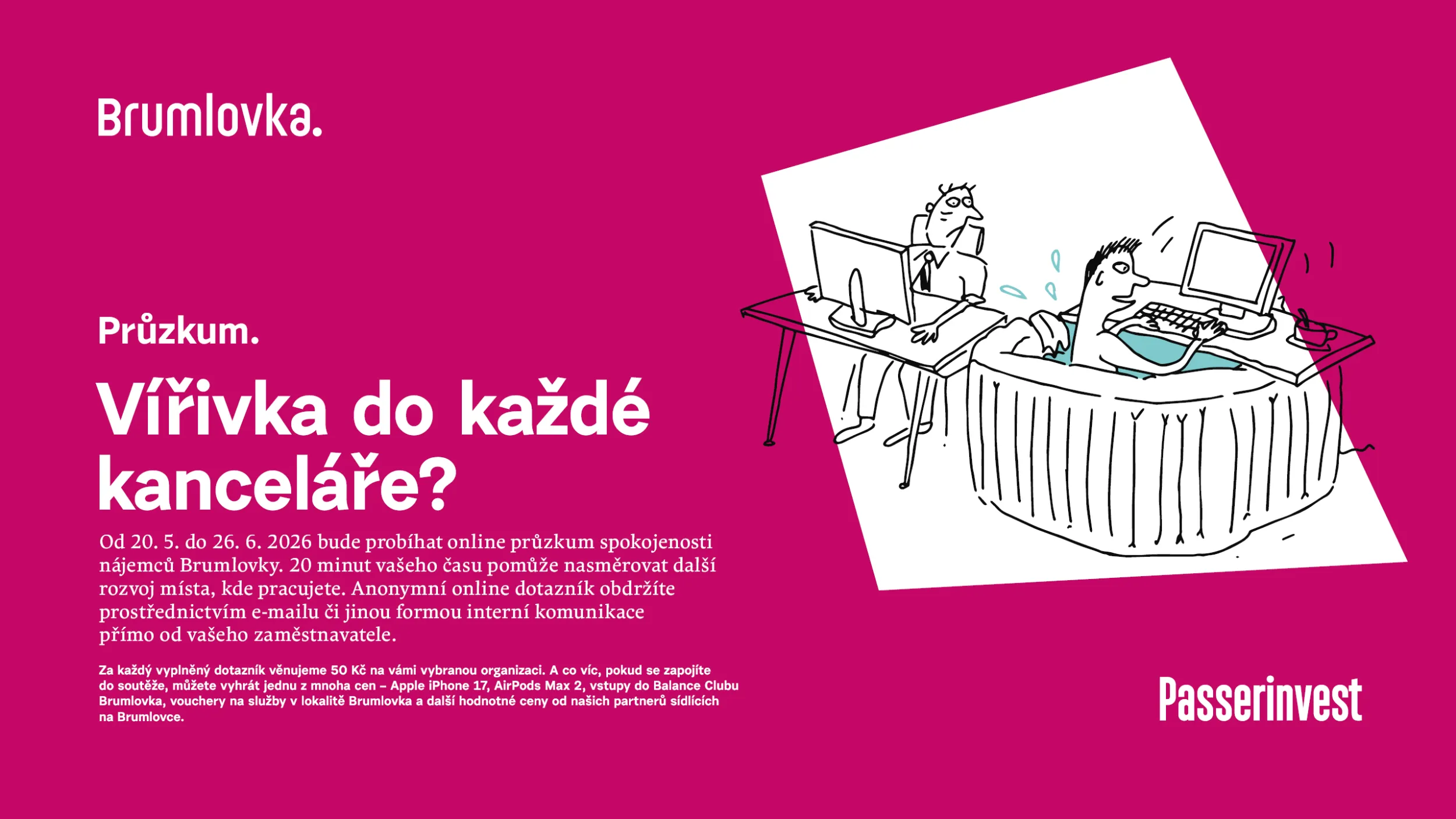 50 Kč na charitu za vyplněný dotazník a možnost výhry iApple iPhone 17, AirPods Max 2, vstupy do Balance Clubu Brumlovka, vouchery na služby v lokalitě Brumlovka a další hodnotné ceny od našich partnerů sídlících na Brumlovce