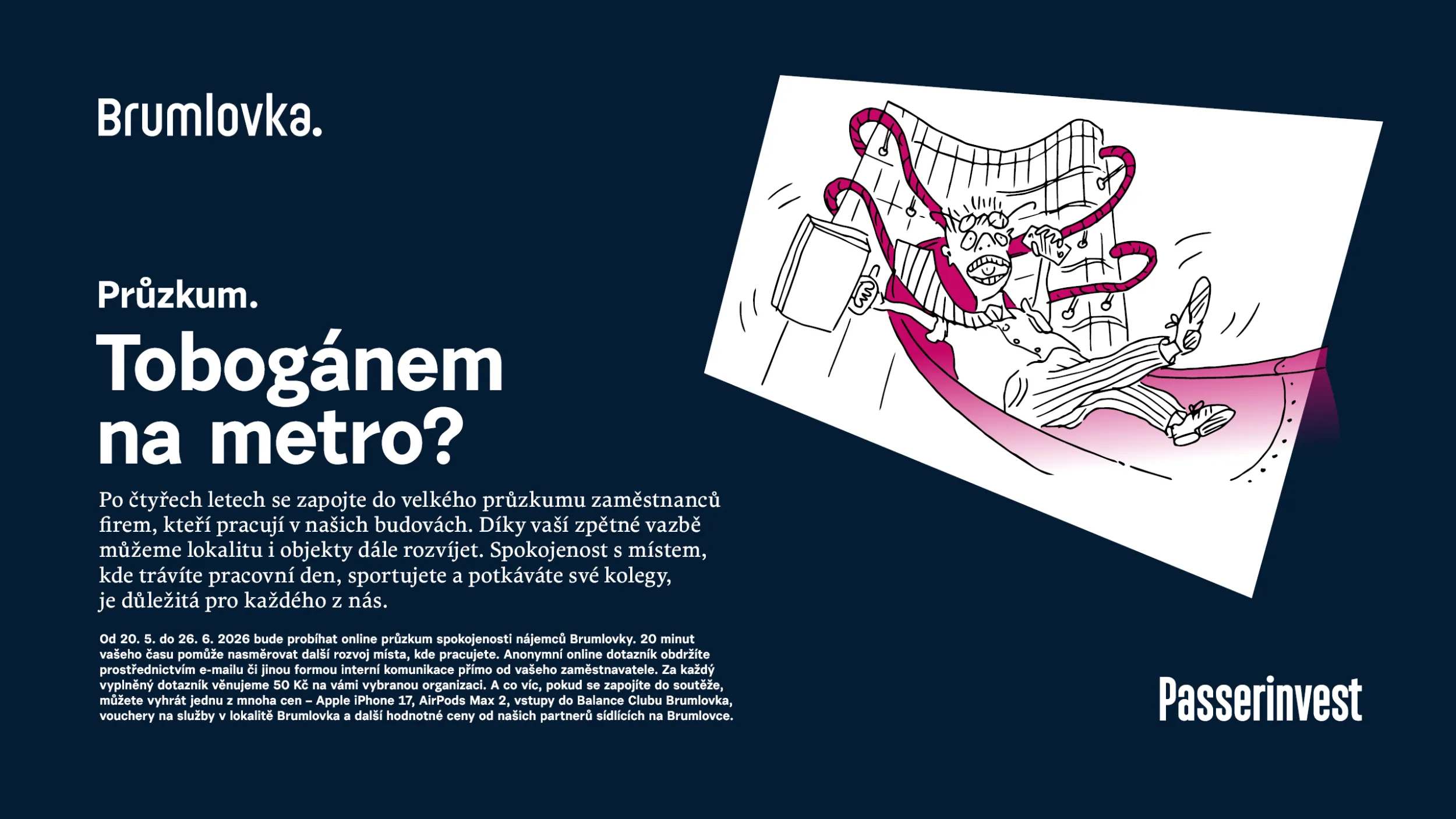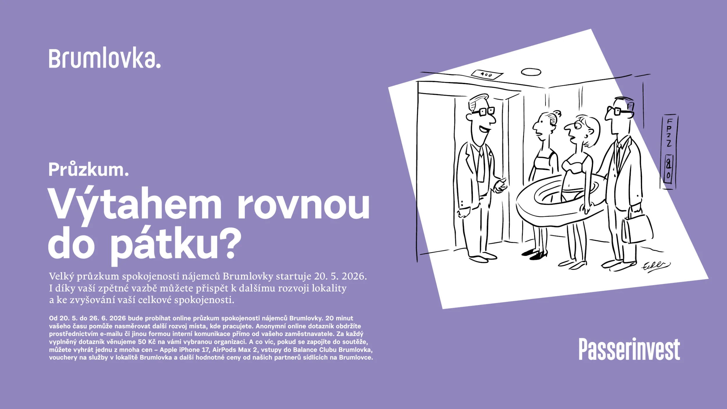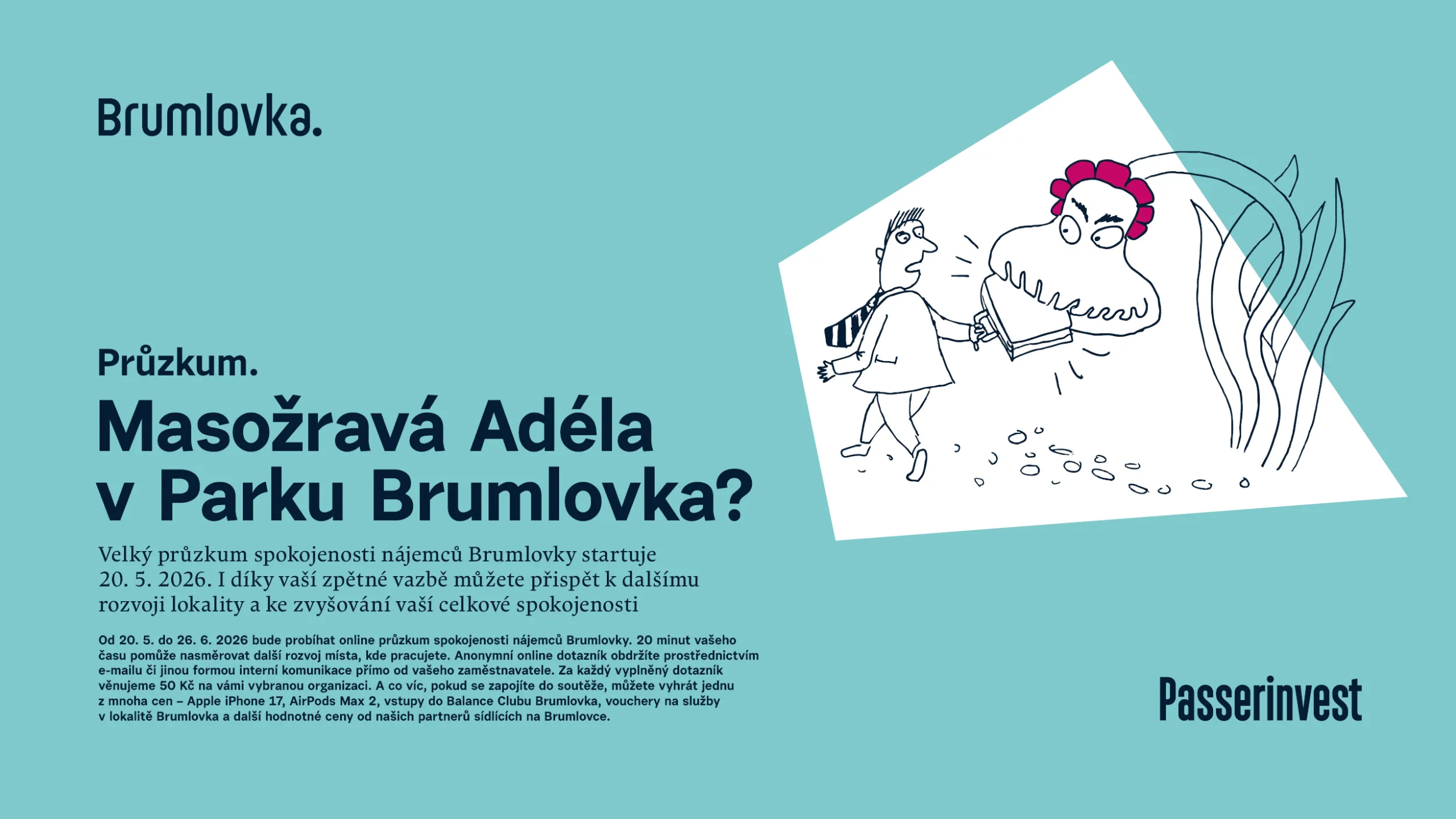 50 Kč na charitu za vyplněný dotazník a možnost výhry iApple iPhone 17, AirPods Max 2, vstupy do Balance Clubu Brumlovka, vouchery na služby v lokalitě Brumlovka a další hodnotné ceny od našich partnerů sídlících na Brumlovce