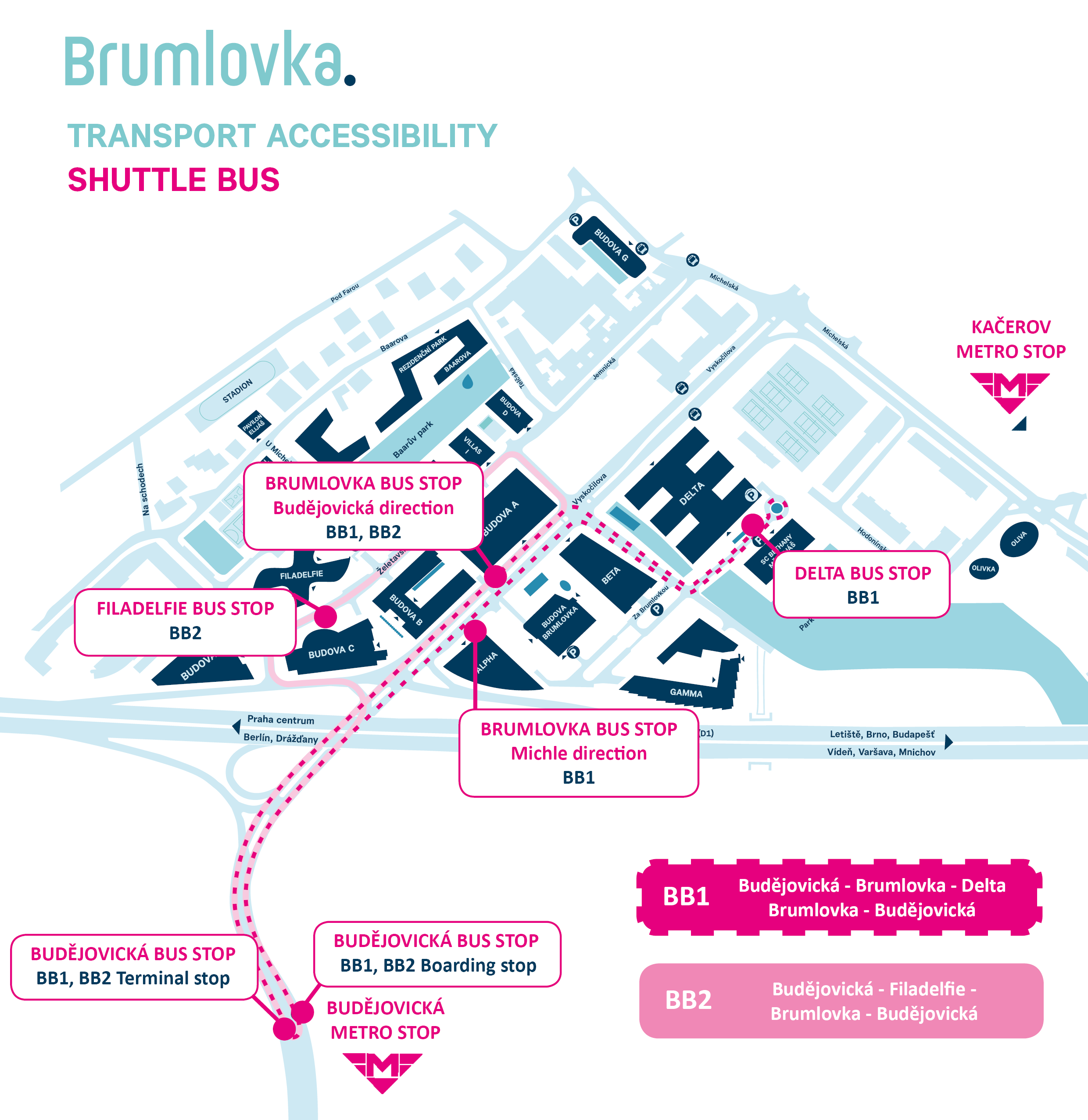 We would like to inform you that in connection with the increasing occupancy of offices and also taking into account the planned repairs of the Barrandov bridge, we are increasing the capacity of the Brumlovka shuttle service from May 2, 2022. We are adjusting the frequency of early evening connections on the BB1 line (Budějovická – Brumlovka – Delta) and also the BB2 line is being renewed (Budějovická – Filadelfie – Brumlovka).